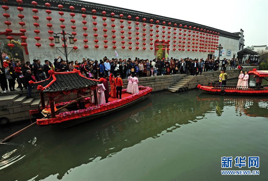 3月30日,游客在湖州市南浔镇张氏旧宅旁观看水乡婚俗表演。 暖春时节,中国历史文化名镇——浙江省湖州市南浔镇一派春意盎然景象。地处太湖南岸的南浔镇所产“辑里丝”驰名中外,当地的水乡风貌和园林宅院,吸引众多海内外游客观光游览。 新华社记者 谭进 摄