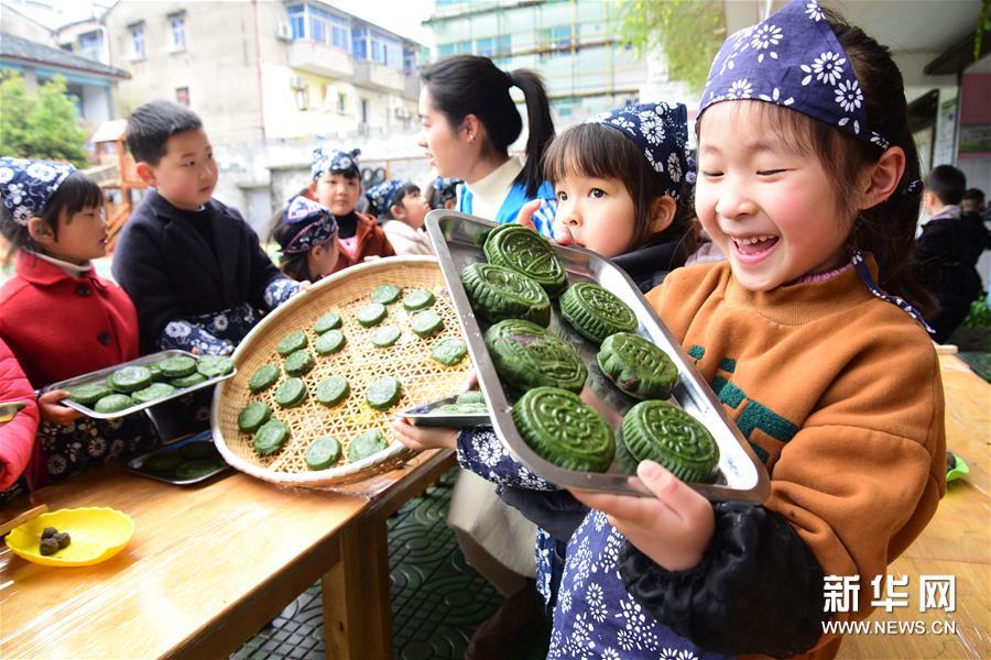 4月3日,浙江省建德市梅城幼儿园的小朋友展示清明粿。 当日,浙江省建德市梅城幼儿园举办以“寻味家乡 清粿飘香”为主题的清明节传统民俗文化活动。孩子们在老师的指导下制作清明粿,体验当地清明节传统习俗。 新华社发(宁文武 摄)
