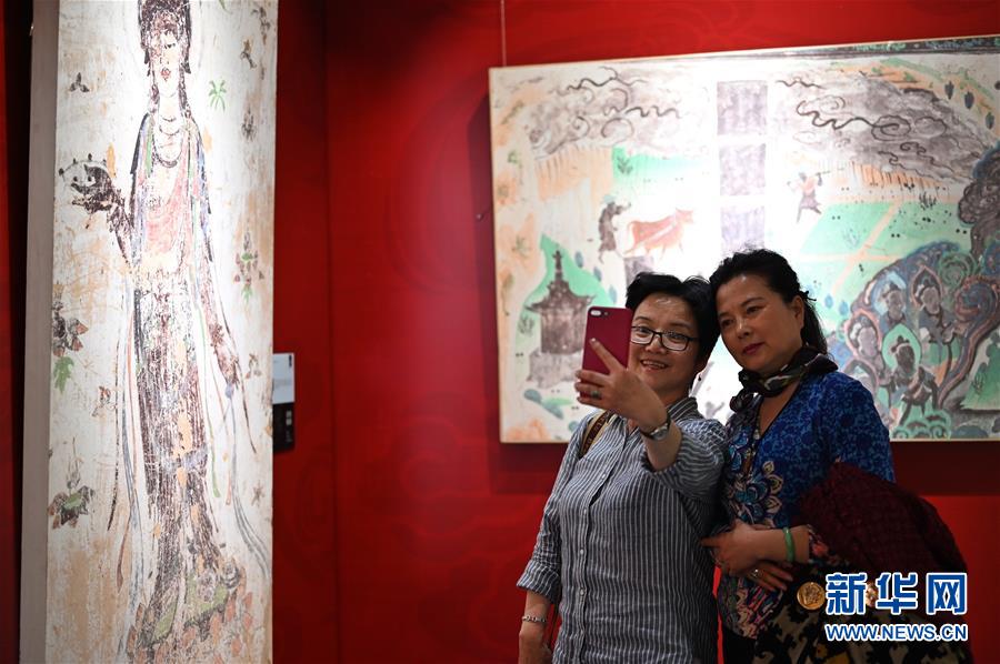 4月10日,两位参观者在展览上留影。 当日,“敦煌 穿越千年的永恒——敦煌壁画艺术精品高校公益巡展”在云南大学开幕。此次展览选取敦煌石窟近50幅精美的壁画,分别以尊像、建筑、图案、飞天、民俗生活等极具代表性的专题,充分展现了敦煌壁画的艺术魅力。该系列展已陆续在全国30多个高校举办,取得了良好的效果。 新华社记者秦晴摄