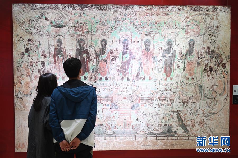 4月10日,参观者在展览上观摩壁画《药师经变》。 当日,“敦煌 穿越千年的永恒——敦煌壁画艺术精品高校公益巡展”在云南大学开幕。此次展览选取敦煌石窟近50幅精美的壁画,分别以尊像、建筑、图案、飞天、民俗生活等极具代表性的专题,充分展现了敦煌壁画的艺术魅力。该系列展已陆续在全国30多个高校举办,取得了良好的效果。 新华社记者秦晴摄