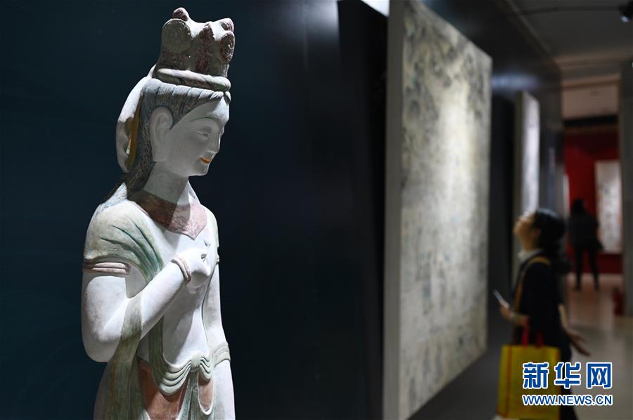 这是4月10日拍摄的展览上的展品。 当日,“敦煌 穿越千年的永恒——敦煌壁画艺术精品高校公益巡展”在云南大学开幕。此次展览选取敦煌石窟近50幅精美的壁画,分别以尊像、建筑、图案、飞天、民俗生活等极具代表性的专题,充分展现了敦煌壁画的艺术魅力。该系列展已陆续在全国30多个高校举办,取得了良好的效果。 新华社记者秦晴摄