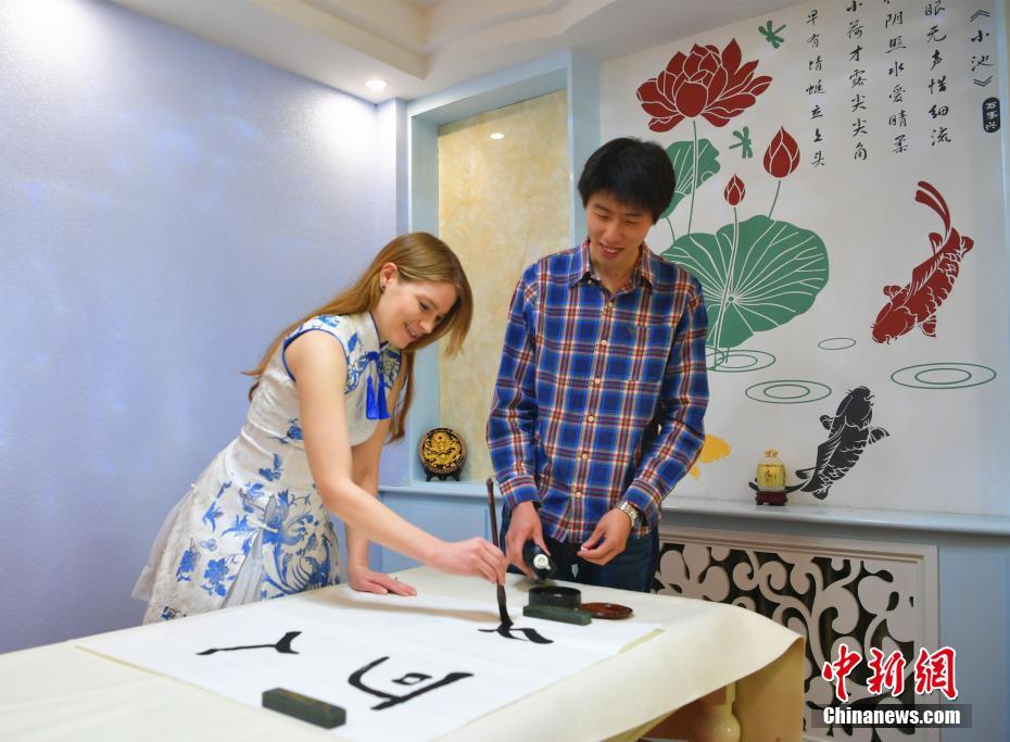 4月16日,美国“90后”姑娘艾米莉在丈夫的陪伴下练习中国书法。中国改革开放以来,越来越多的外国人来到中国工作、学习和生活。2017年3月,艾米莉作为“洋媳妇”,跟随回国的小伙儿郭了达来到中国的河北石家庄。两年过去,这个来自大洋彼岸的姑娘不但融入了中国人的生活,还深深爱上了中国文化。艾米莉说:“我喜欢中国文化,当我写书法、练国画或弹古琴的时候,我感觉到宁静和放松,我喜欢这种感觉。”中新社记者 翟羽佳 摄