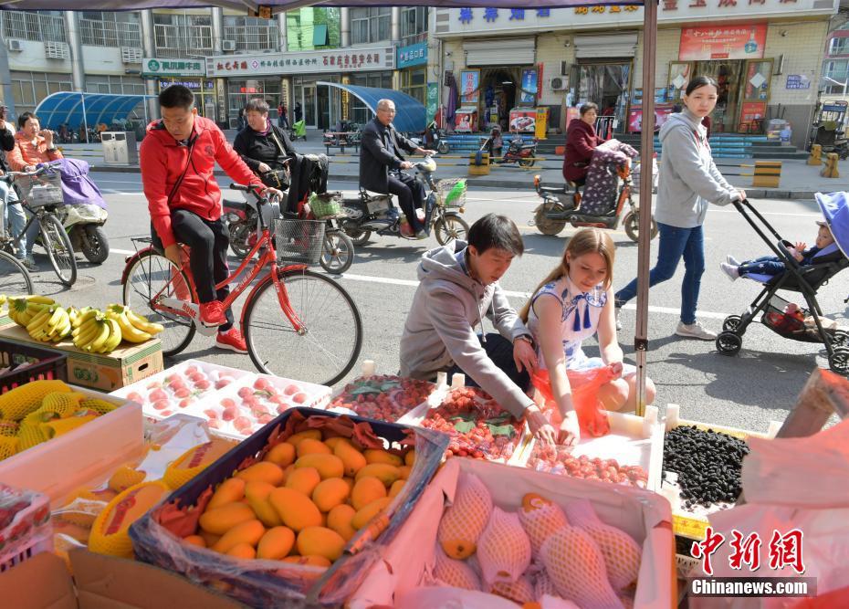 4月16日,美国“90后”姑娘艾米莉与丈夫一起逛街、买水果。中国改革开放以来,越来越多的外国人来到中国工作、学习和生活。2017年3月,艾米莉作为“洋媳妇”,跟随回国的小伙儿郭了达来到中国的河北石家庄。两年过去,这个来自大洋彼岸的姑娘不但融入了中国人的生活,还深深爱上了中国文化。艾米莉说:“我喜欢中国文化,当我写书法、练国画或弹古琴的时候,我感觉到宁静和放松,我喜欢这种感觉。”中新社记者 翟羽佳 摄