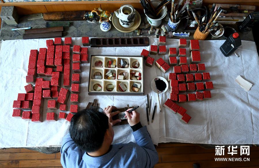 4月16日,耿玉峰在刻制印章作品。 新华社发(陈其保 摄)
