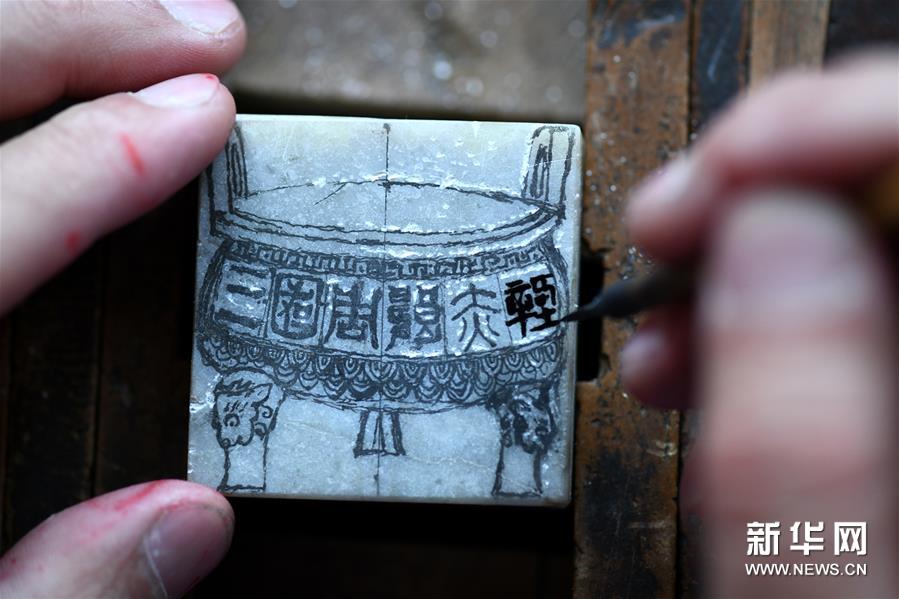 4月16日,耿玉峰在刻制印章作品。新华社发(梁子栋 摄)