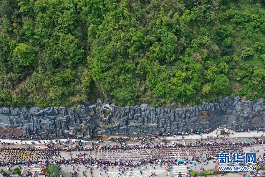 4月18日,台江县苗族群众参加盛装游演活动(无人机拍摄)。当日,贵州省黔东南苗族侗族自治州台江县迎来一年一度的苗族姊妹节。节日期间将举行苗族盛装游演、千人长桌宴、千人游方体验、苗族手工创意大赛等一系列活动。 姊妹节是台江县苗族同胞的传统节日,2006年被列入第一批国家级非物质文化遗产名录。 新华社发(欧阳光林 摄)