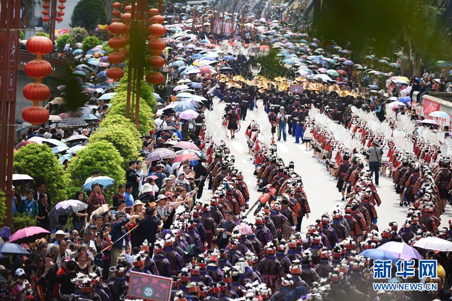 4月18日,台江县苗族群众参加盛装游演活动。当日,贵州省黔东南苗族侗族自治州台江县迎来一年一度的苗族姊妹节。节日期间将举行苗族盛装游演、千人长桌宴、千人游方体验、苗族手工创意大赛等一系列活动。 姊妹节是台江县苗族同胞的传统节日,2006年被列入第一批国家级非物质文化遗产名录。 新华社记者 杨文斌 摄