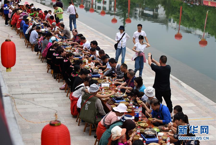 4月18日,游客在台江县参加苗族姊妹节长桌宴体验活动。当日,贵州省黔东南苗族侗族自治州台江县迎来一年一度的苗族姊妹节。节日期间将举行苗族盛装游演、千人长桌宴、千人游方体验、苗族手工创意大赛等一系列活动。 姊妹节是台江县苗族同胞的传统节日,2006年被列入第一批国家级非物质文化遗产名录。 新华社记者 杨文斌 摄