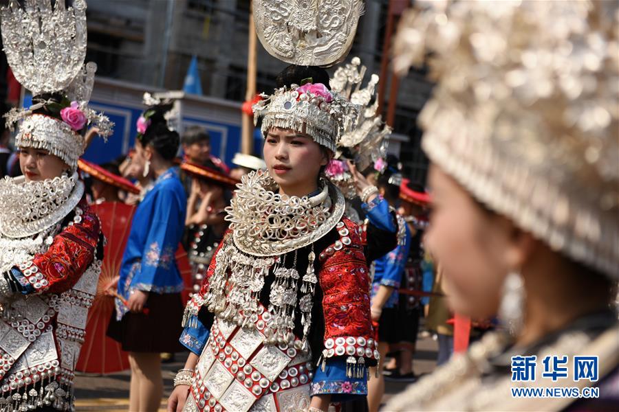 4月18日,台江县苗族群众参加盛装游演活动。当日,贵州省黔东南苗族侗族自治州台江县迎来一年一度的苗族姊妹节。节日期间将举行苗族盛装游演、千人长桌宴、千人游方体验、苗族手工创意大赛等一系列活动。 姊妹节是台江县苗族同胞的传统节日,2006年被列入第一批国家级非物质文化遗产名录。 新华社记者 杨文斌 摄