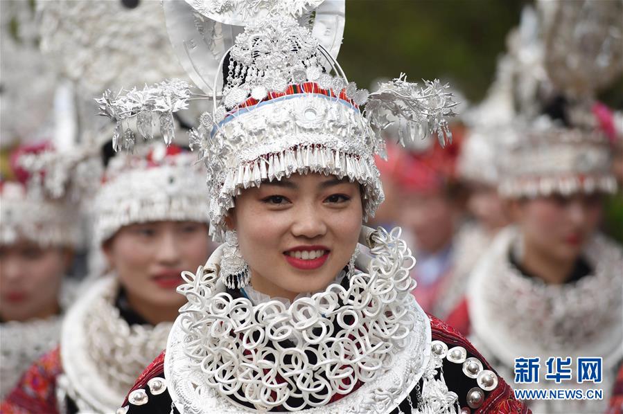 4月18日,台江县苗族群众参加盛装游演活动。当日,贵州省黔东南苗族侗族自治州台江县迎来一年一度的苗族姊妹节。节日期间将举行苗族盛装游演、千人长桌宴、千人游方体验、苗族手工创意大赛等一系列活动。 姊妹节是台江县苗族同胞的传统节日,2006年被列入第一批国家级非物质文化遗产名录。 新华社发(刘开福 摄)