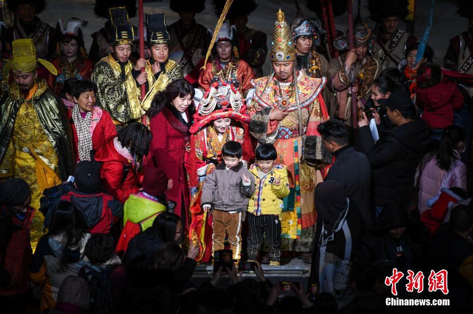 4月20日晚,大型实景剧《文成公主》第七季在拉萨市次角林上演。该剧以拉萨自然山水为背景,讲述了文成公主与松赞干布和亲的历史故事。全剧分为五幕,时长约90分钟,自2013年首演以来,该剧已成功演出逾千场,接待观众210万余人次。图为演出结束后观众与演职人员合影留念。中新社记者 何蓬磊 摄