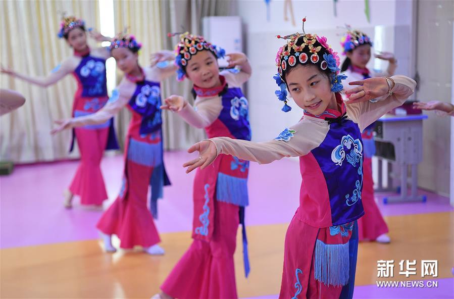 4月24日,宜黄县水北新区小学学生在排练戏曲健身操。 新华社记者 万象 摄