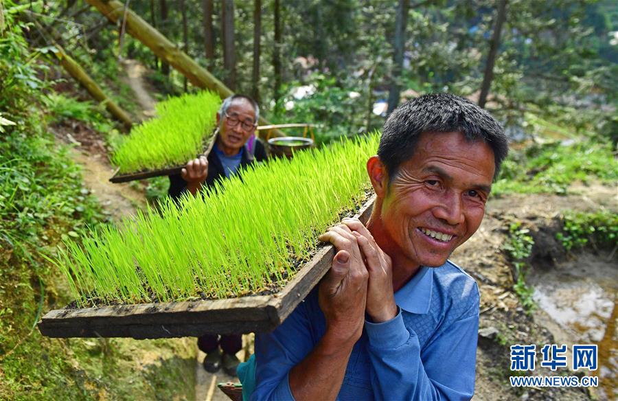 在黔桂乌英苗寨,村民扛着秧苗上山,准备插秧(4月16日摄)。 新华社记者 黄孝邦 摄