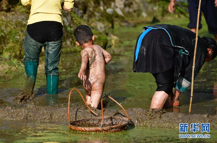 在黔桂乌英苗寨,小朋友在稻田里玩耍(4月16日摄)。 新华社记者 黄孝邦 摄