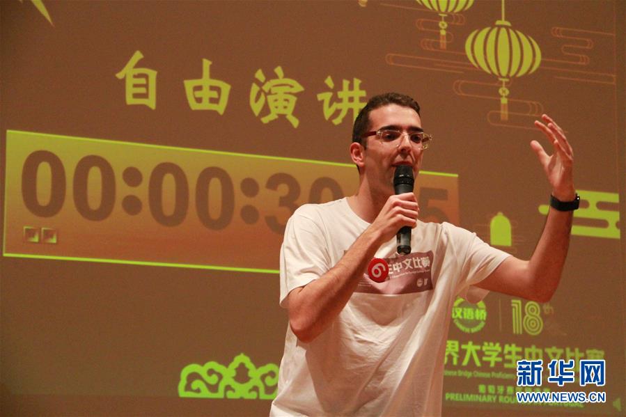 5月4日,在葡萄牙布拉加,里斯本大学学生托马斯·罗德里格斯·伊列乌(中文名杜甫)在“汉语桥”比赛中演讲。 第18届“汉语桥”世界大学生中文比赛葡萄牙赛区比赛4日在位于布拉加市的米尼奥大学举行。里斯本大学学生托马斯·罗德里格斯·伊列乌(中文名杜甫)获得冠军。 新华社记者温新年摄