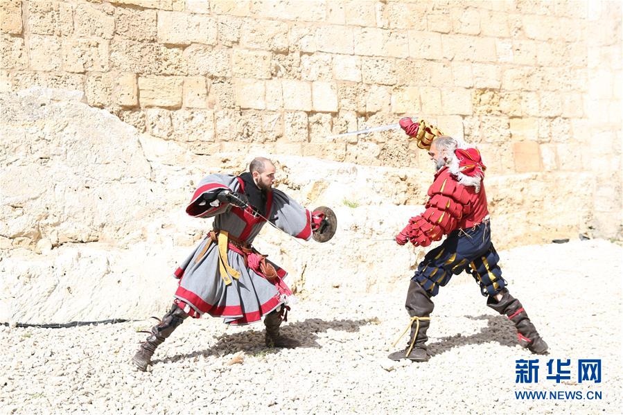 5月5日,在马耳他姆迪纳古城举行的中世纪文化节上,两名装扮成欧洲中世纪时期士兵的演员进行格斗表演。 新华社发(袁韵摄)