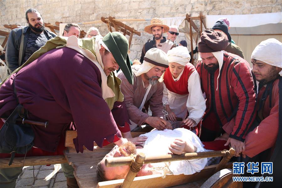 5月5日,在马耳他姆迪纳古城举行的中世纪文化节上,一群身着欧洲中世纪时期服饰的演员再现中世纪医生给病人做手术的场景。 新华社发(袁韵摄)