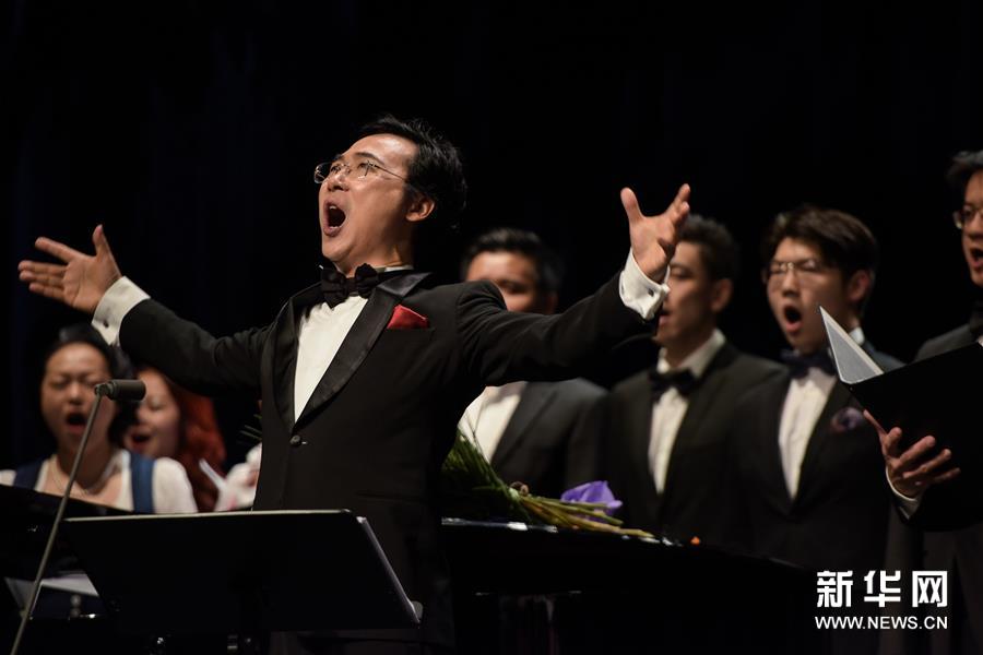 5月7日,在奥地利维也纳,著名男中音歌手廖昌永(前)在音乐会上演唱。新华社记者郭晨摄