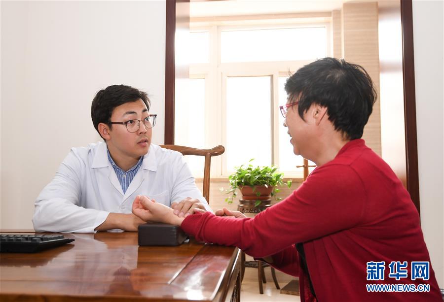 5月14日,萨震(左)在国医堂实习,为患者切脉。新华社记者陈晔华摄