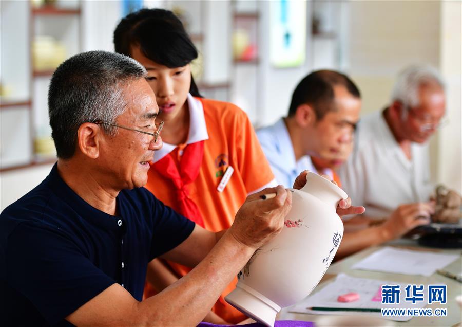 5月20日,晋江市磁灶镇陶瓷技艺传承人吴康为(左一)在给磁灶镇岭畔小学陶艺班的小学生传授陶器绘画技艺。 近年来,福建省晋江市大力推动“非遗进校园”,将南音、高甲戏、传统手工艺等非遗项目融入乡土教材。此外,晋江还在各个学校设立非遗传习点,推动非遗项目与学校教育有机结合。 新华社记者 魏培全 摄