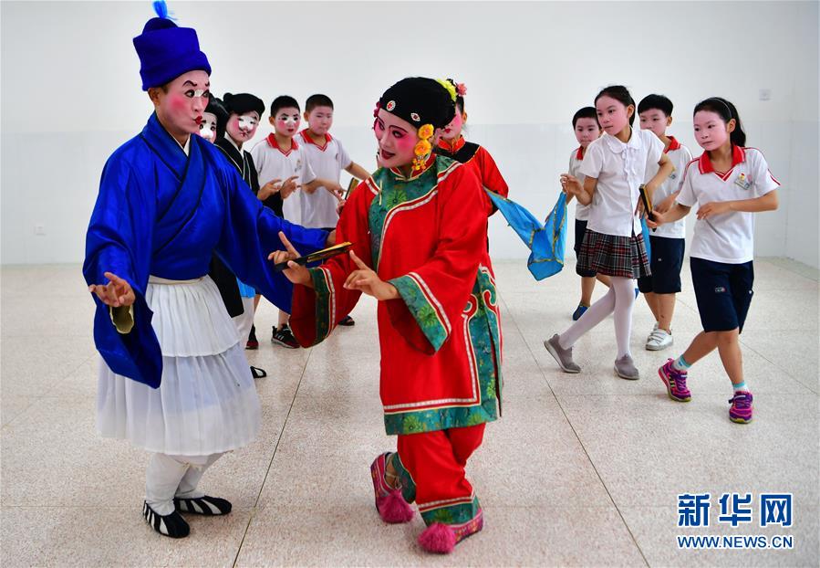 5月20日,晋江市高甲戏柯派表演艺术中心的老师(左一、左二)在给晋江象山小学高甲戏兴趣小组的学生传授高甲戏的基本动作。 近年来,福建省晋江市大力推动“非遗进校园”,将南音、高甲戏、传统手工艺等非遗项目融入乡土教材。此外,晋江还在各个学校设立非遗传习点,推动非遗项目与学校教育有机结合。 新华社记者 魏培全 摄