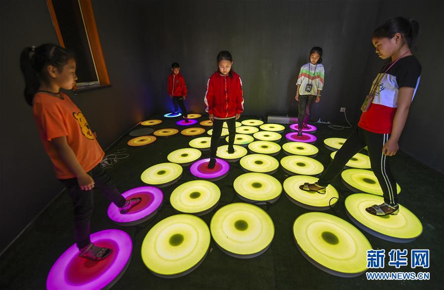 5月20日,在河北省武强周窝音乐体验中心,武强县周窝小学的孩子们在体验声光变化。 当日,武强县周窝小学的孩子们走进武强周窝音乐体验中心,零距离体验声光电带来的科技魅力。5月19日至26日是2019年全国科技活动周。活动期间,河北省武强县开展了“音画情、科普行”科普宣传活动。 新华社记者 李晓果 摄
