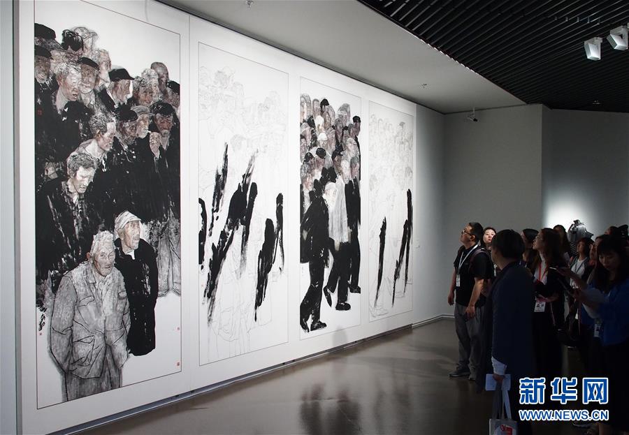 5月21日,观众在欣赏巨幅国画。 当日,第十二届中国艺术节全国优秀美术作品展览、全国优秀书法篆刻作品展览、全国优秀摄影作品展览在上海中华艺术宫开幕。展览作品总量近1200件,展期长达3个月,这也是目前整体规模最大且展期最长的国家级专业大展。 新华社记者 任珑 摄