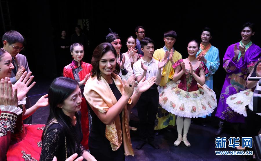 5月20日,在巴西首都巴西利亚,巴西第一夫人米歇尔·博索纳罗(前左二)在演出结束后会见演员。 中国中央芭蕾舞团20日在巴西利亚为巴西首都的观众带来了一场古典与现代相接、中式与西式相容的芭蕾盛宴。 新华社发(刘宇摄)