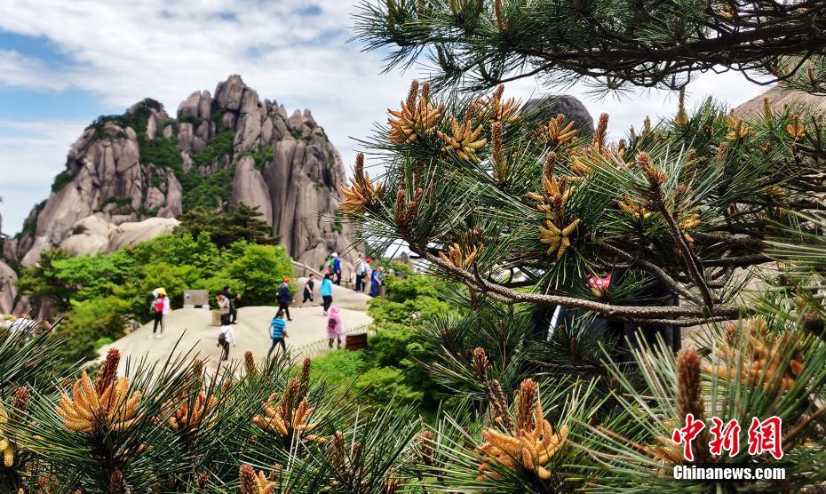5月21日,安徽黄山莲花峰,黄山松花开如金铃。黄山松松花又叫松黄,单束呈笔头状,多束松花常常攒于枝头绽放,远远望去好似金铃。中新社发 叶永清 摄