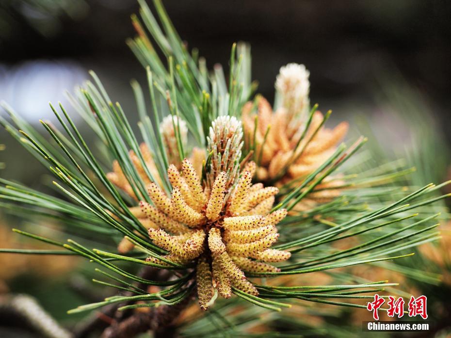 5月21日,安徽黄山风景区天海景点,一株黄山松的松花绽放枝头。黄山松松花又叫松黄,单束呈笔头状,多束松花常常攒于枝头绽放,远远望去好似金铃。中新社发 叶永清 摄