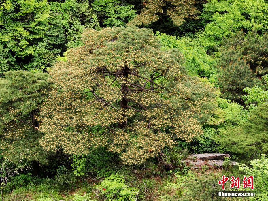 5月21日,安徽黄山风景区天海景点,俯瞰一株茂盛的黄山松,松花绽放于枝头。黄山松松花又叫松黄,单束呈笔头状,多束松花常常攒于枝头绽放,远远望去好似金铃。中新社发 叶永清 摄