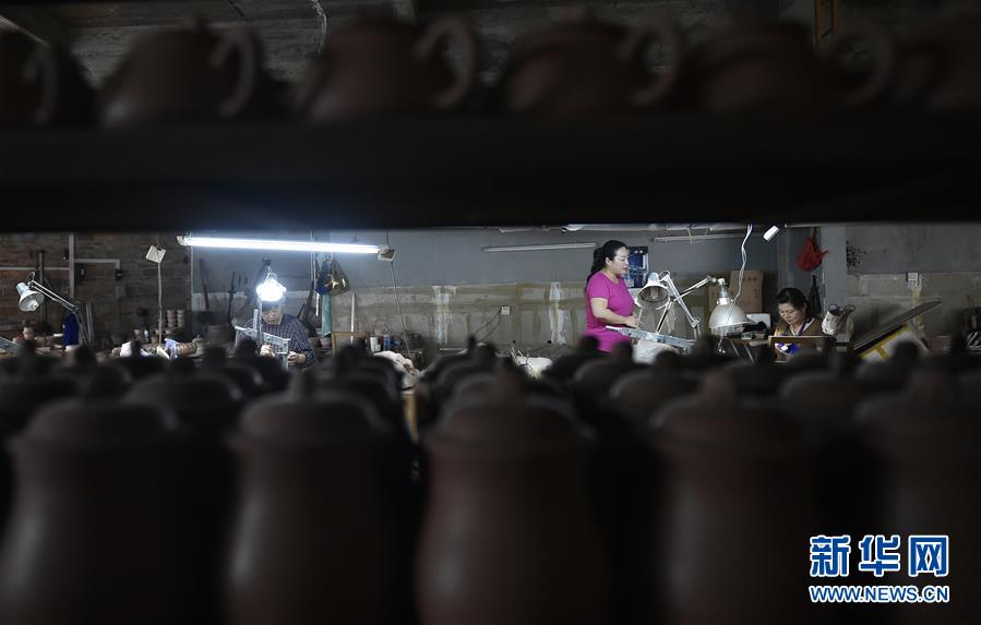 5月21日,郭卉(中)在工作室的生产车间指导员工制作坭兴陶制品。
