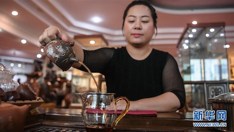 郭卉在工作室中给新制作完成的坭兴陶茶壶“试水”(4月27日摄)。新华社记者 张爱林 摄