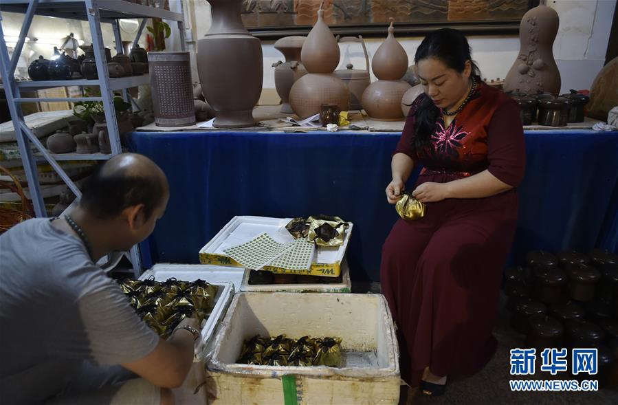 5月21日,郭卉(右)在工作室中和员工一起为准备外销的坭兴陶制品装箱。新华社记者 鲁鹏 摄