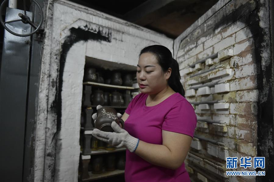 5月21日,郭卉在工作室的生产车间检查刚烧制完成的坭兴陶制品。新华社记者 张爱林摄