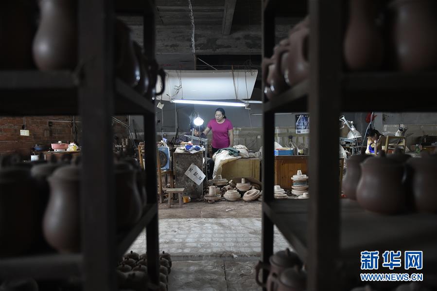 5月21日,郭卉(中)在工作室的生产车间指导员工制作坭兴陶制品。新华社记者 鲁鹏 摄