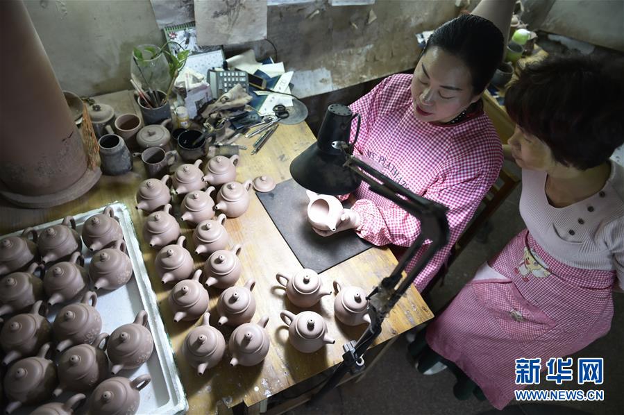 5月21日,郭卉(左)在工作室中指导技师雕刻坭兴陶制品。新华社记者 张爱林 摄