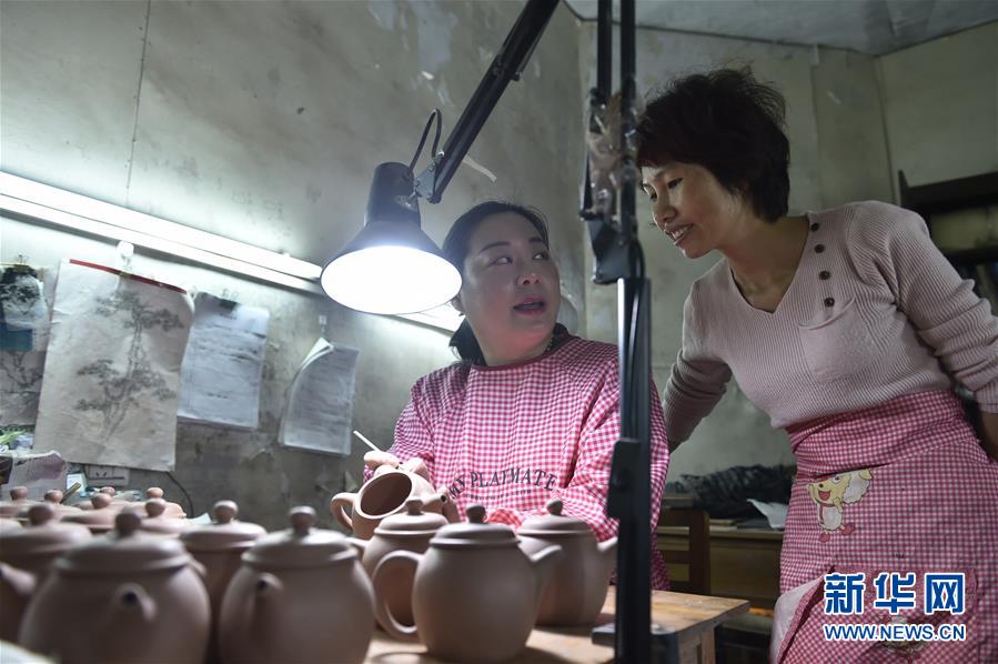 5月21日,郭卉(左)在工作室中指导技师雕刻坭兴陶制品。新华社记者 鲁鹏 摄