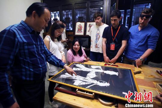 一位俄罗斯媒体代表在学习雕刻皮影。王磊 摄