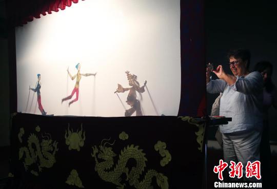 一位俄罗斯媒体代表演绎皮影。王磊 摄