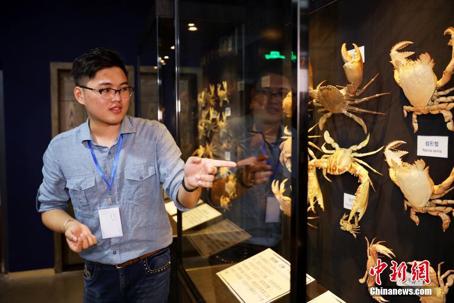 5月28日,“神奇的盔甲武士”螃蟹博物馆在厦门曾厝垵文创中心开馆,上千只从澎湖而来的螃蟹标本集中进行展示。图为来自台湾澎湖的“90”后馆长柳政鸿向观众介绍螃蟹标本。中新社记者 李思源 摄
