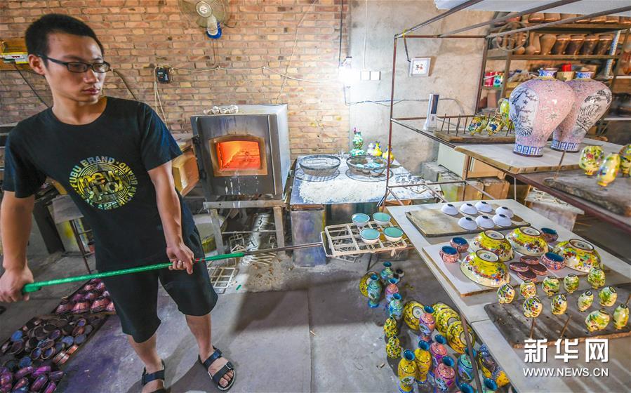 6月18日,景县龙华镇手工艺人从电炉中取出烧制好的铜胎画珐琅半成品。 近年来,河北景县坚持传承当地传统铜胎画珐琅技艺。目前,当地铜胎画珐琅从业者有800多人,相关产品远销国外,带动了当地农民增收。 新华社记者 李晓果 摄