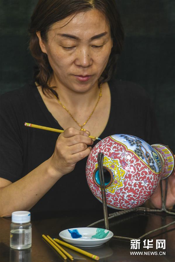 6月18日,景县龙华镇手工艺人在绘制铜胎画珐琅“梅瓶”。 近年来,河北景县坚持传承当地传统铜胎画珐琅技艺。目前,当地铜胎画珐琅从业者有800多人,相关产品远销国外,带动了当地农民增收。 新华社记者 李晓果 摄