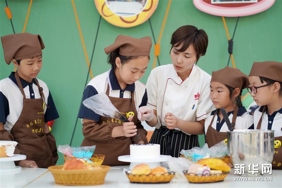 6月26日,内丘县实验小学老师在烘焙课堂指导学生学习糕点制作。新华社记者 朱旭东 摄