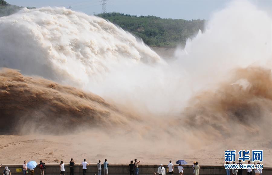 7月2日,游客在小浪底库区观看“双龙”飞腾景观。 当日,从黄河小浪底水库下泄的清澈水流与裹挟泥沙的混浊水流分别从明流洞、排沙洞奔腾而出,好似白黄两条“巨龙”。 新华社发 苗秋闹 摄 图片来源:新华网
