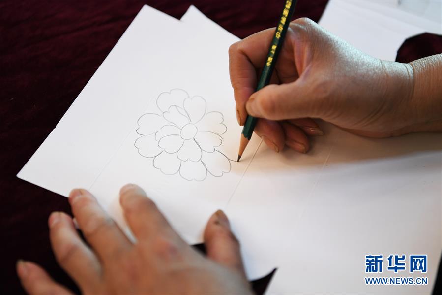 7月4日,解爱英在位于交城县天宁镇的展厅内绘制图稿。 新华社记者 杨晨光 摄