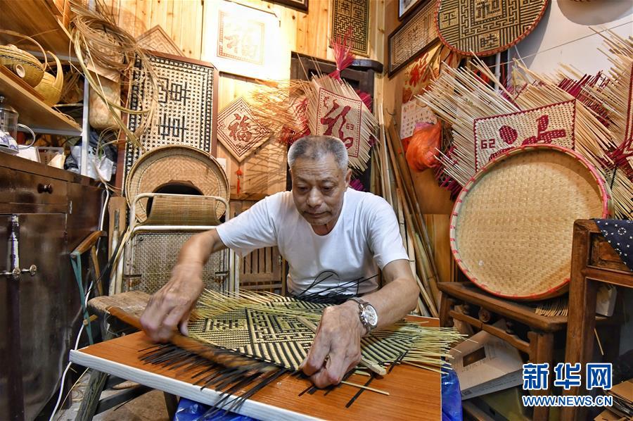 7月4日,马吉林在德清县新市镇自己的竹编店铺制作竹编。 今年74岁的马吉林是浙江省湖州市德清县新市镇马氏竹编技艺传承人,他10岁开始跟随父亲马孝泉学做竹编,15岁随父亲走南闯北做手艺。60多年来,马吉林始终致力于竹编技艺传承与发扬,他还将工具进行改良,使篾条更加光滑均匀,做出来的竹工艺品更加精美。2019年,新市马氏竹编入选湖州市非物质文化遗产。 新华社记者 李欣 摄