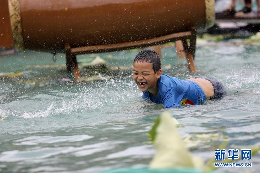 7月8日,参加剑河县“六月六”活动的一名孩子在戏水。 当日是农历六月初六,贵州省黔东南苗族侗族自治州剑河县群众载歌载舞,以舞龙、跳水鼓舞、民歌对唱等方式欢度“六月六”。 新华社发(杨家孟 摄)