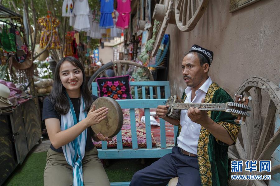 在喀什古城景区阿热亚路“古丽的家”特色庭院里,祖丽卡麦尔·麦麦提吐尔洪(左)打起手鼓欢迎游客到来(7月9日摄)。 新疆素有“歌舞之乡”美誉。在喀什古城景区里,歌舞也是当地人民生活中不可缺少的一部分。欣赏独具风情的歌舞也成了游客们游览古城的重要内容。 2019年喀什古城景区旅游发展迅速。景区管委会提供的数据显示,上半年古城景区接待游客人数超过31万人次,同比增长超过九成。 新华社记者 赵戈 摄