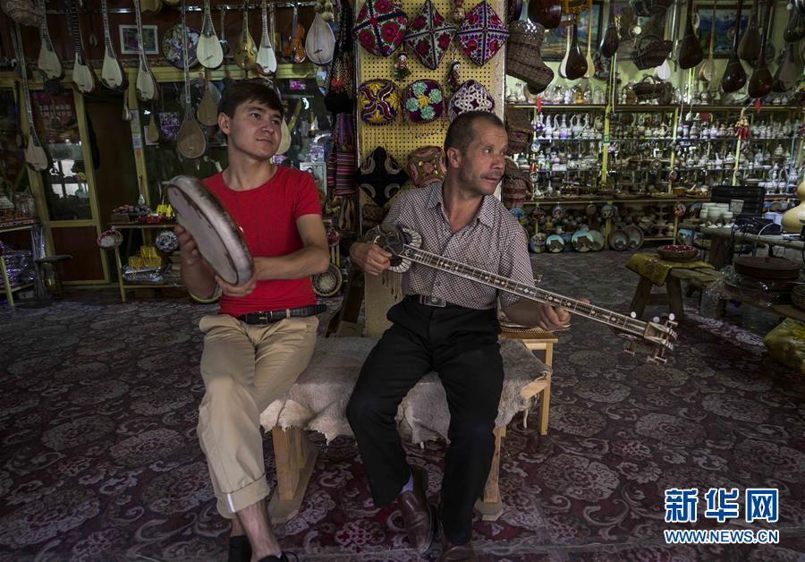 喀什古城景区“老城艾山玉山手工木器艺术品展览店”店主玉买尔江·玉山(左)和工作人员为顾客展示民族乐器(7月6日摄)。 新疆素有“歌舞之乡”美誉。在喀什古城景区里,歌舞也是当地人民生活中不可缺少的一部分。欣赏独具风情的歌舞也成了游客们游览古城的重要内容。 2019年喀什古城景区旅游发展迅速。景区管委会提供的数据显示,上半年古城景区接待游客人数超过31万人次,同比增长超过九成。 新华社记者 赵戈 摄